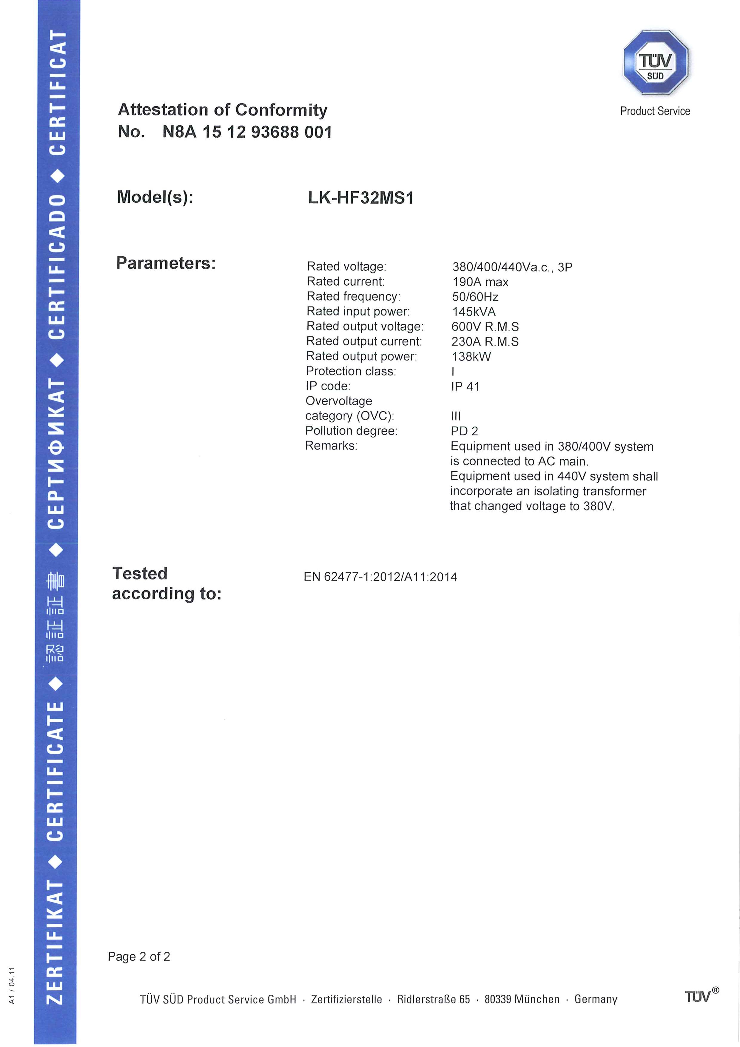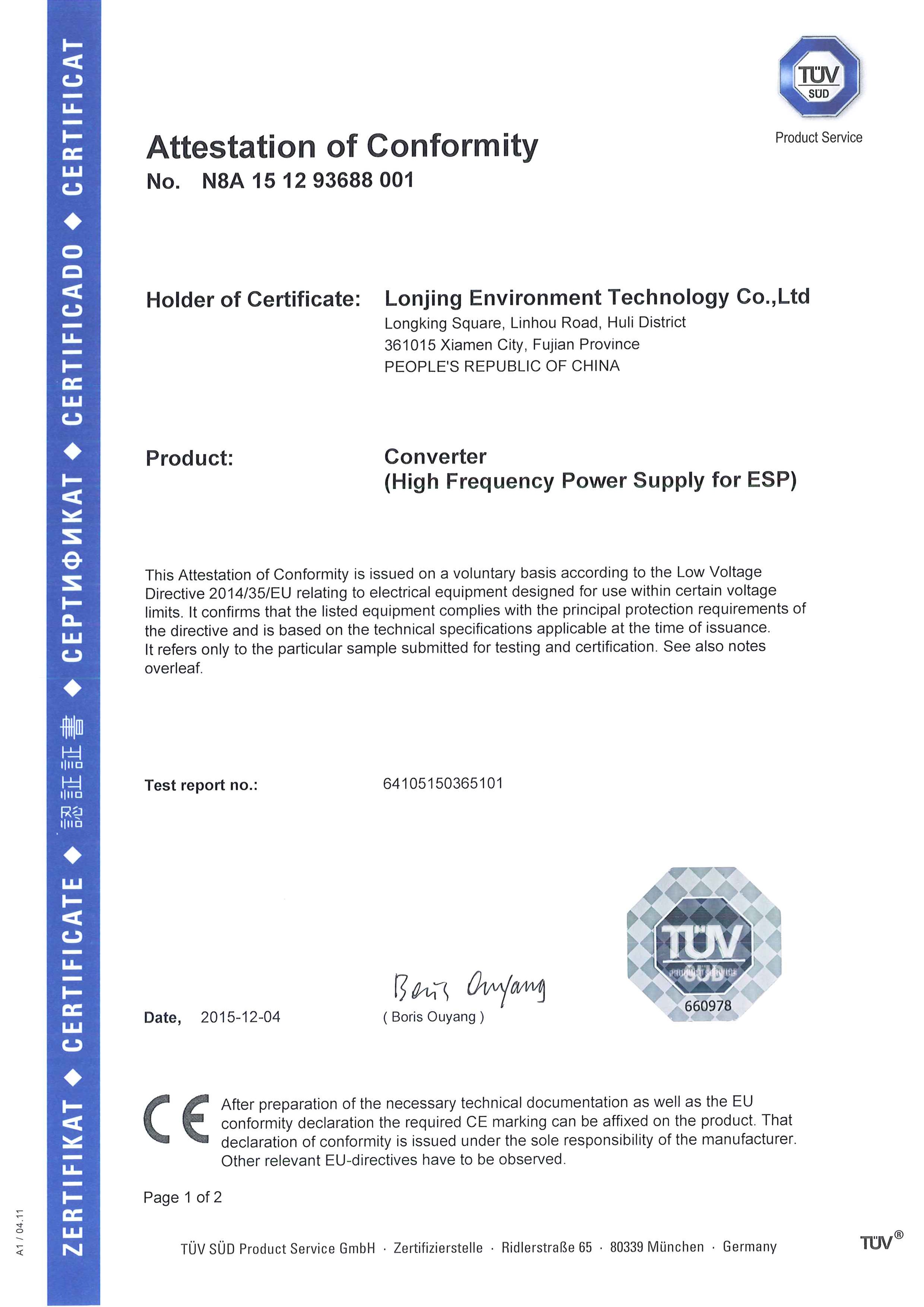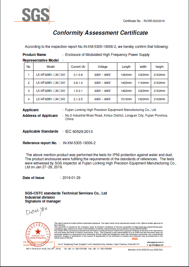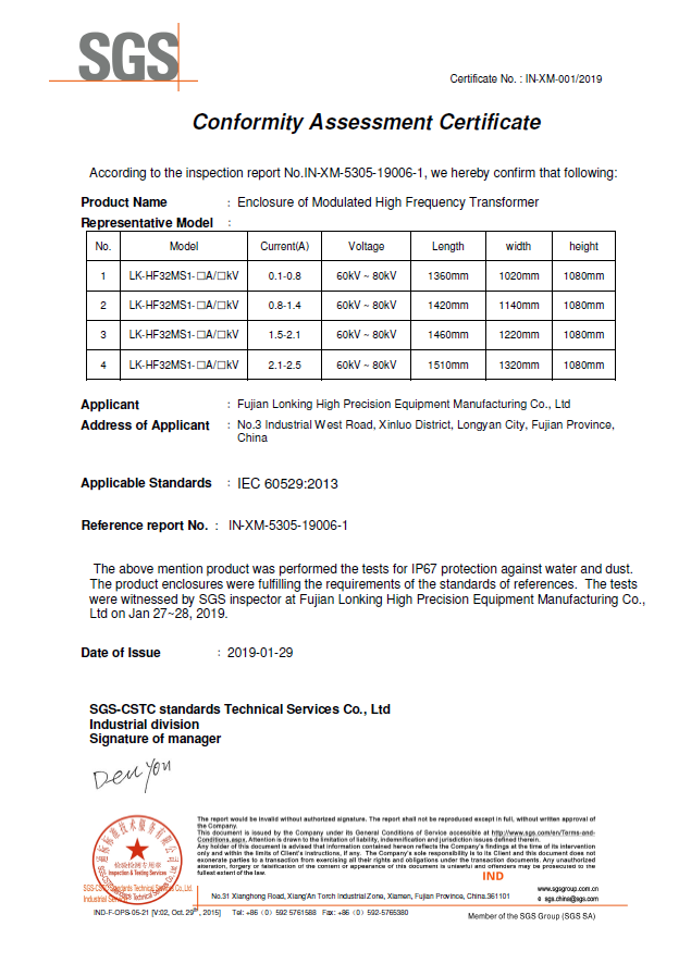 龙净高频电源LK-HF32MS1系列产品不但在国内市场大展身手,同时在欧盟市场也敢为人先。2015年,在德国TUV南德意志集团两位工程师的现场见证下,龙净高频电源顺利取得CE证书;2019年,龙净调制型分体式变压器获得SGS的IP67防护等级认证,调制型一体式高频电源获得SGS的IP56防护等级认证。有力的证明了龙净调制型高频电源安全、稳定、先进的特点。