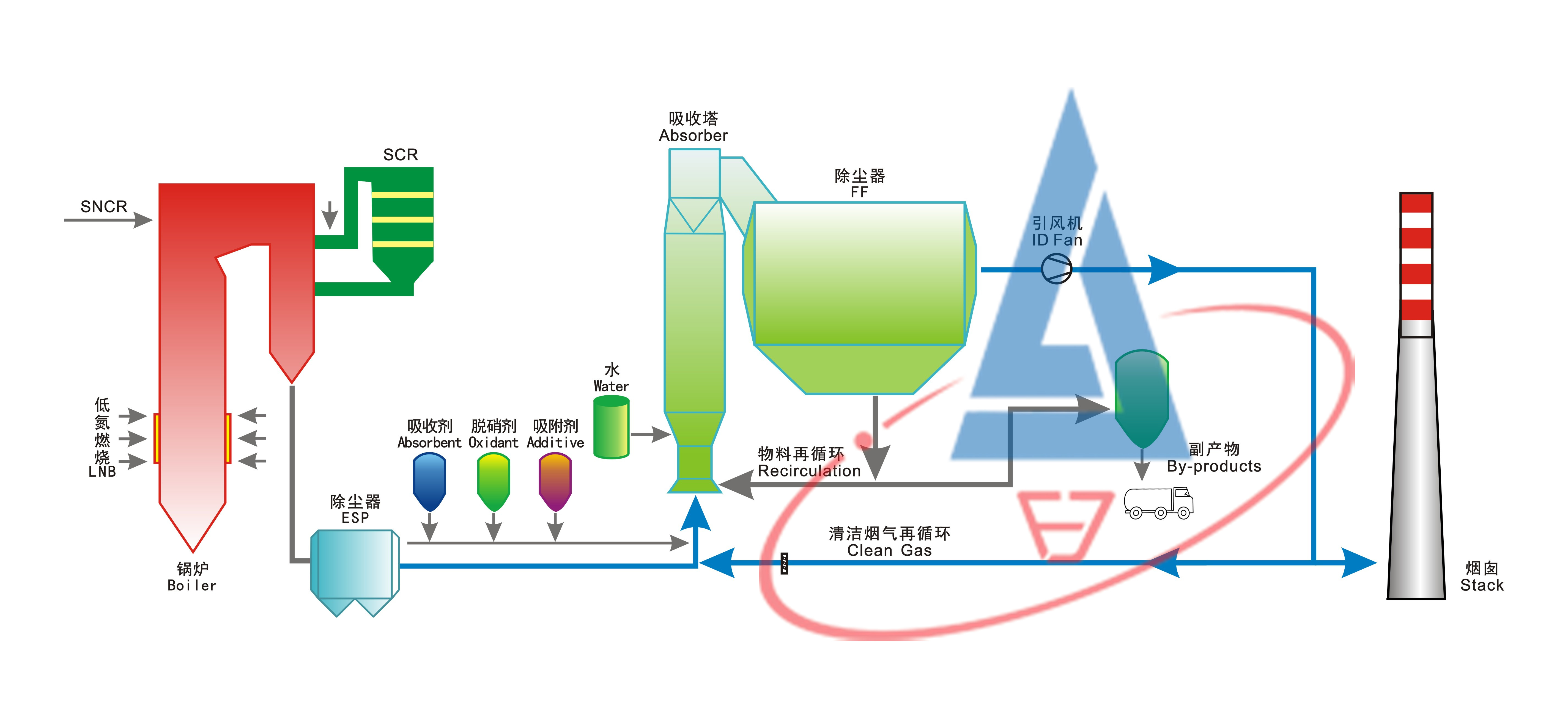 一个典型的DSC-M烟气干式“超净+”系统由炉内脱硝、预除尘器(可选)、吸收剂及吸附剂制备、COA协同脱硝装置、吸收塔、脱硫灰再循环、工艺水系统、脱硫除尘器以及仪表控制系统等组成,其烟气流程为锅炉/窑炉→预除尘器(可选)→吸收塔→脱硫布袋除尘器→引风机→烟囱,工艺流程图见图1、图2。