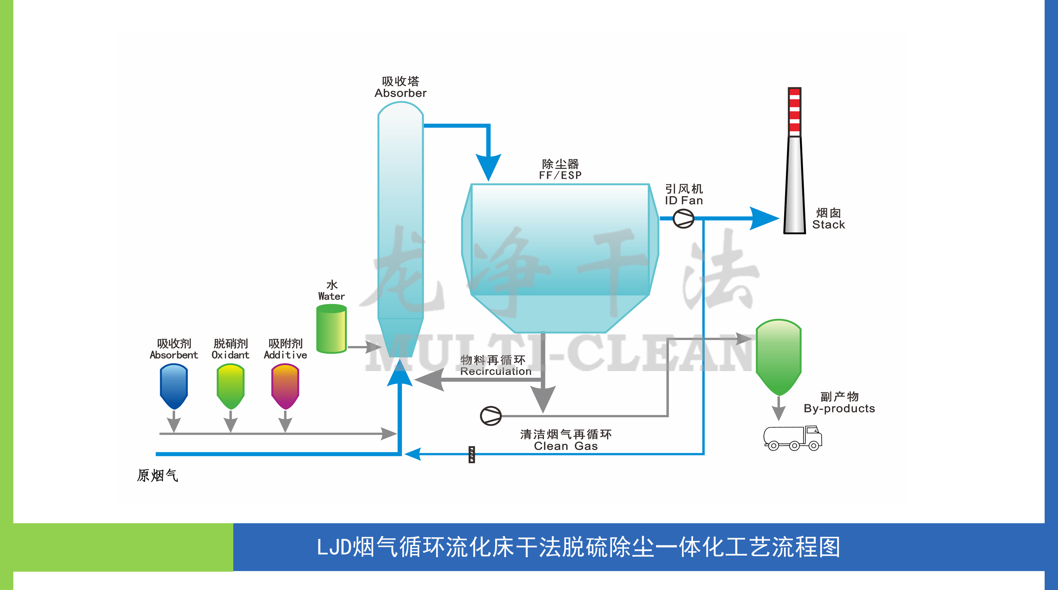 LJD烟气循环流化床干法脱硫除尘一体化技术,为福建龙净干法团队在2001年引进德国鲁奇干法脱硫技术上的基础上,经过赴德培训与吸收创新,并针对各类烟气治理特点专门研发满足环保达标要求的干法脱硫除尘一体化技术,目前最大应用业绩规模为660MW电厂、600m2烧结机。该技术以其系统简洁、投资省、运行费用低、没有废水、烟囱无需防腐等深受用户选用,经过十多年的不断创新,该技术已经升级为脱硫除尘超净技术,也成为干式超净+系统解决方案中的重要组成部分。